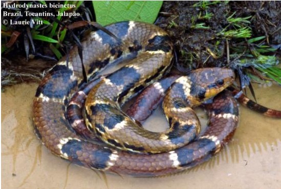 Colorido dorsal com 16 faixas negras com o centro avermelhado, entre os pares de faixas negras existem 2 faixas amarelas com o centro escuro. Cabeça avermelhada com faixas escuras atrás dos olhos.