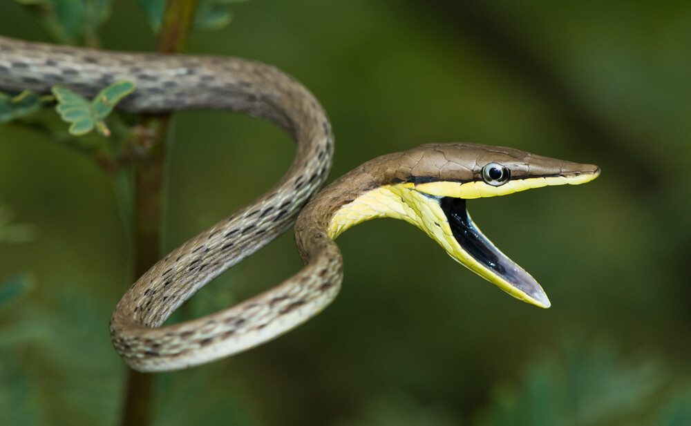A Cobra bicuda, Oxybelis aeneus (Serpentes, Colubridae), é uma serpente arborícola, de coloração amarronzada, longa e delgada, características que a tornam bem semelhante a um galho seco.
